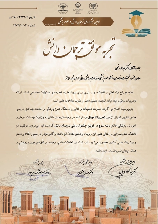 * به گزارش وب‌دا خوزستان، معاونت تحقیقات و فناوری دانشگاه علوم پزشکی جندی شاپور اهواز در اولین جشنواره ملی ترجمان دانش وزارت بهداشت، درمان و آموزش پزشکی رتبه سوم بخش تجربیات موفق را به خود اختصاص داد.